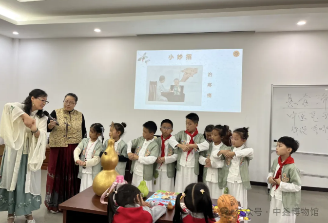 10月7日上午,中鑫艺术博物馆联合非遗百忍堂传承人张珍珠老师、虞娃娃仁惠研艺堂举办“红领巾爱祖国——与非遗同行 与中医对话”公益研学活动,张珍珠是本次研学活动的主讲老师。课程包含对中医的初步认识,药神壶翁的故事、葫芦创意手绘等。